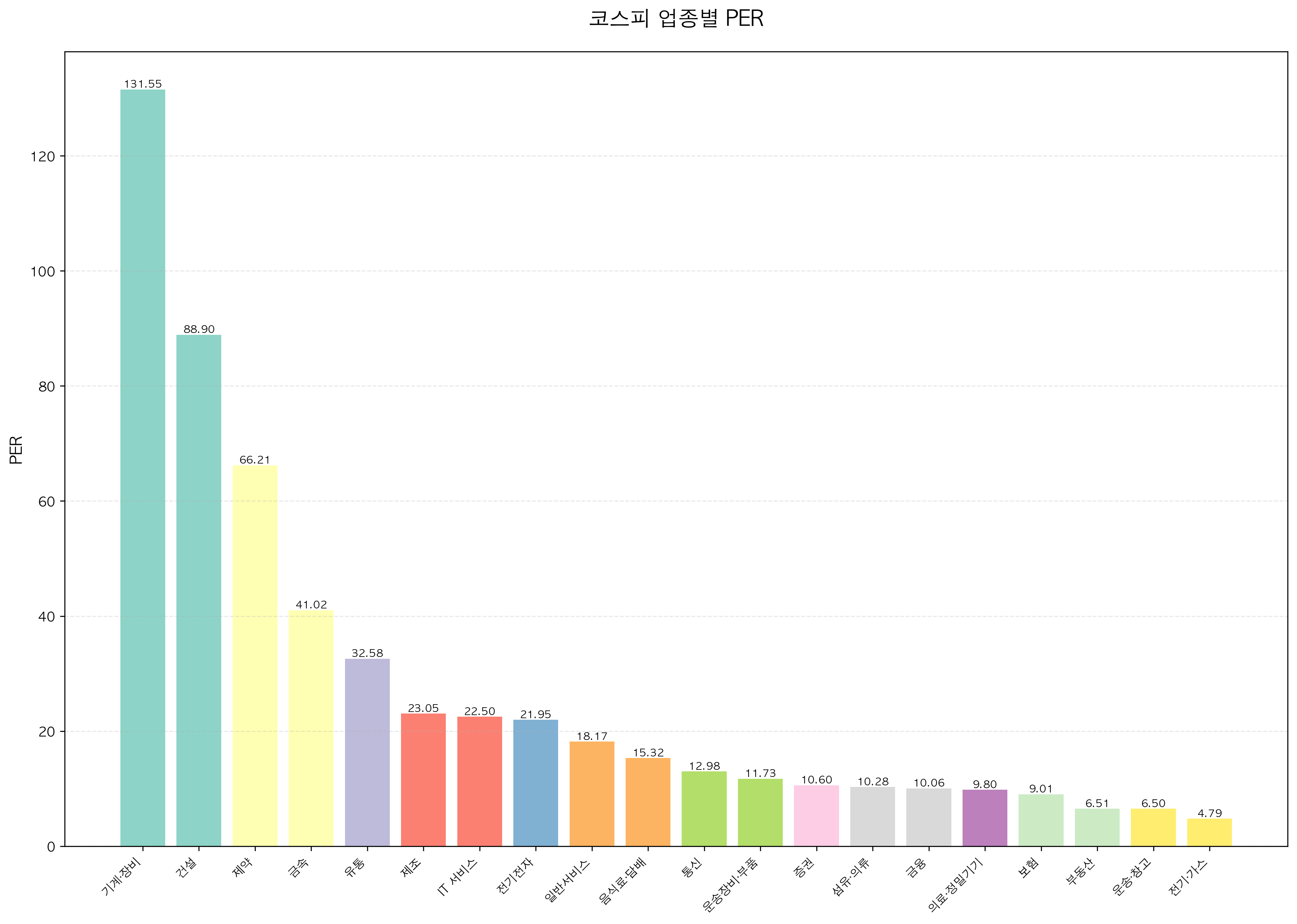 그렇다면 PER이 어떤 경우에 높은지, 어떤 경우에 낮은지 이해하기 위해 코스피 업종별 평균을 한 번 비교해보겠습니다.